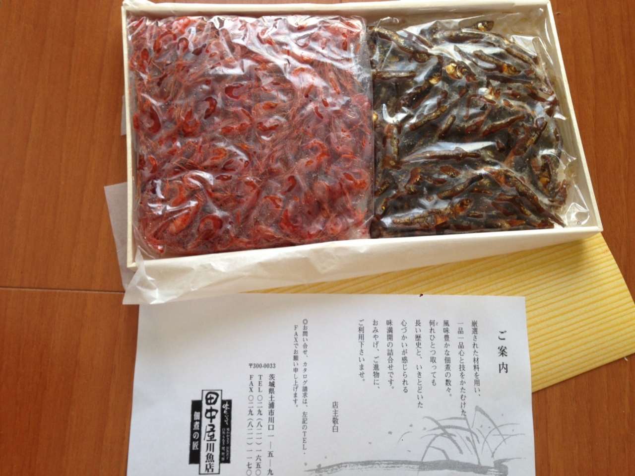 霞ケ浦名産の佃煮の専門店で、霞ケ浦産のわかさぎと川エビ佃煮の詰め合わせセットを購入しました。川エビは照りのある赤色の仕上げで、殻のぱりぱりした食感と甘目の味付けでご飯がなくてもおつまみとしてもおいしい品でした。