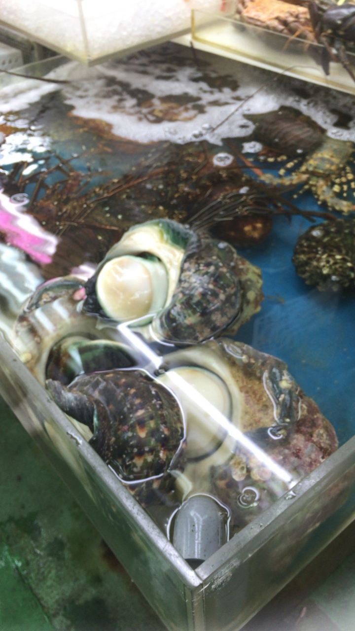 青や赤のお魚や大きな貝が沢山あり、買って2階で裁いてもらおうと思いましたが、ちなみに一料理500円で裁いてくれるらしいです。