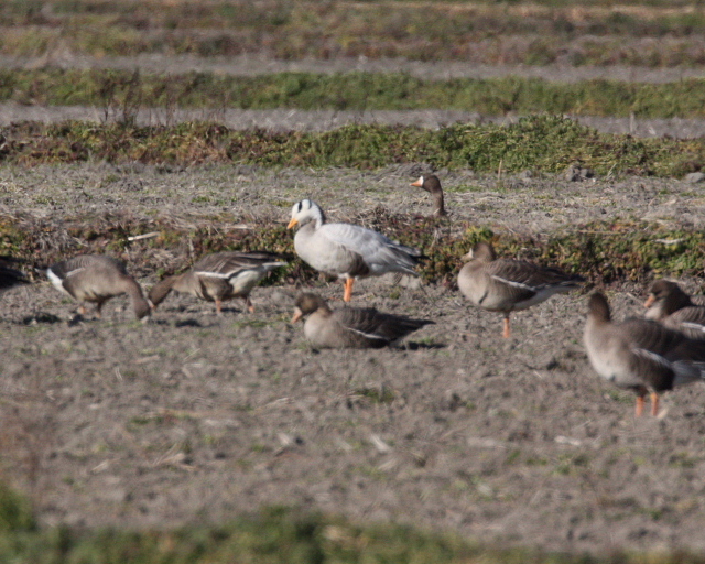 - マガンの群れと、珍鳥インドガンは見応え十分です。