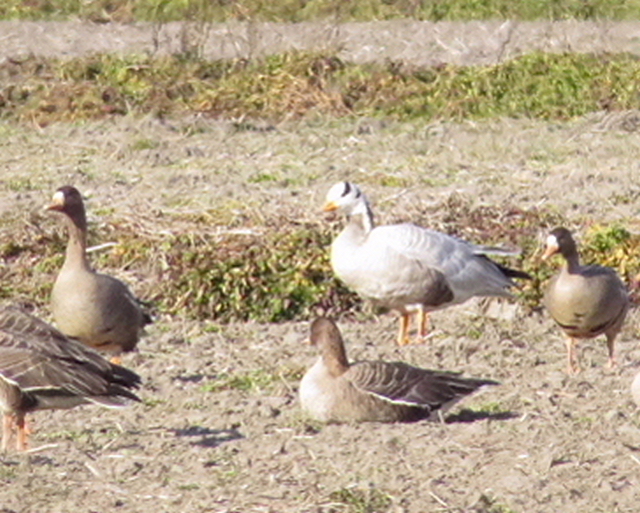 今回もインドガンは沼の中では見つからず、周辺の田圃でマガンの群れの中に入って休息していました。初めて見る鳥なので興奮しましたが、距離がちょっと遠すぎて写真の迫力がイマイチですが、証拠写真にはなると思います。