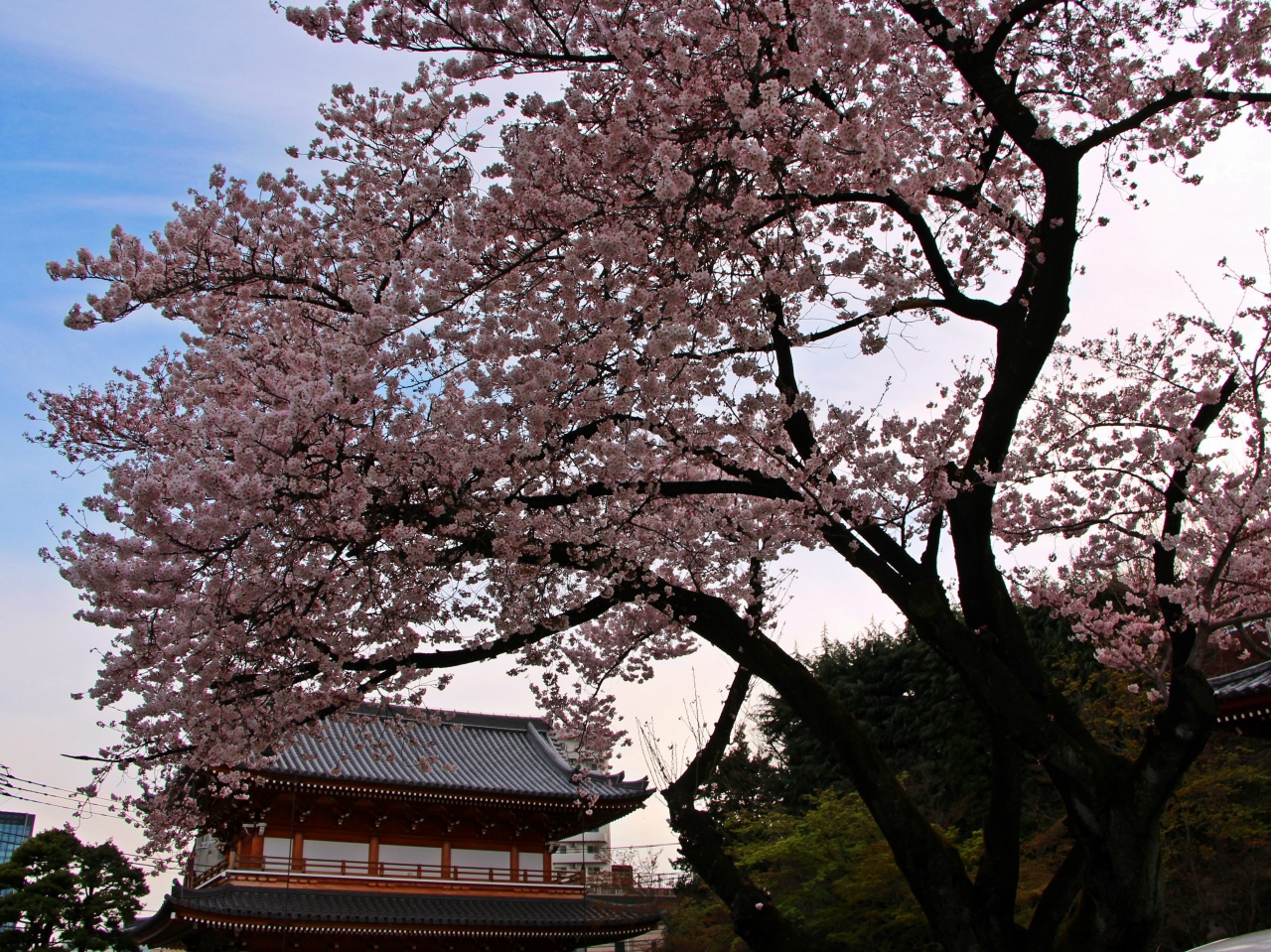 境内には何本か大きな桜の木があり、朱色の山門との相性もバッチリ。
