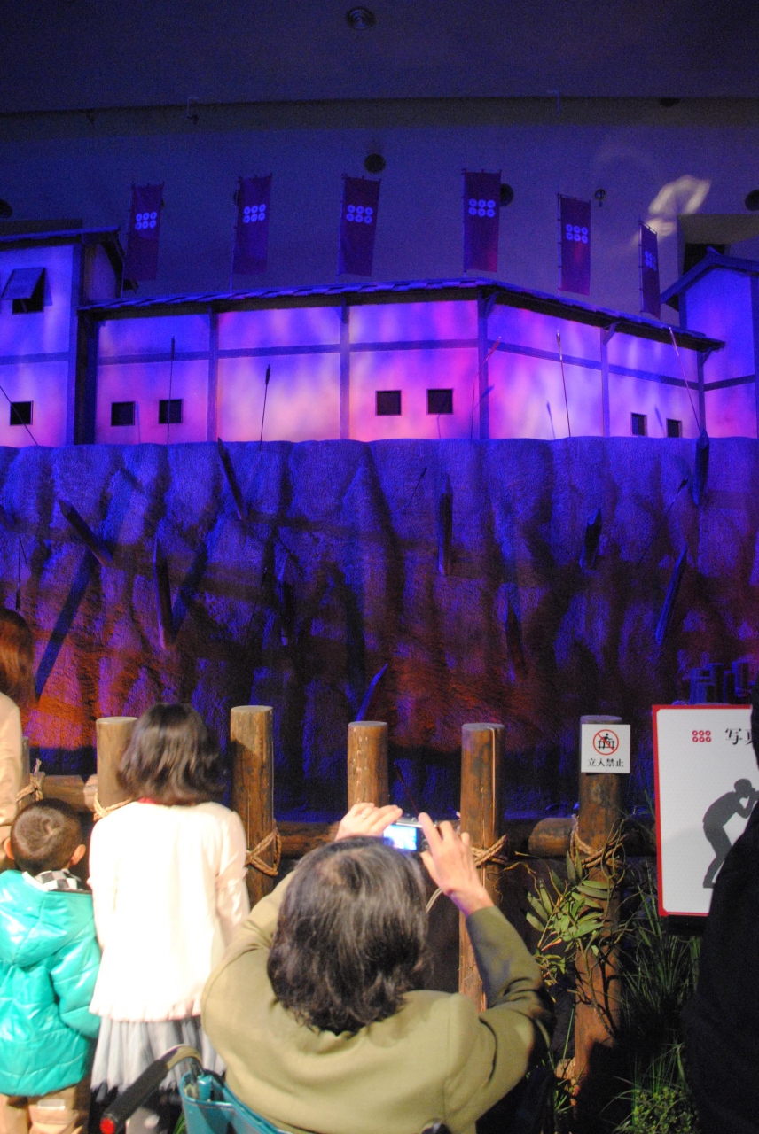 途中、大坂冬の陣の真田丸を見上げる所に真田の朱の鎧兜が展示されており、ここが唯一の撮影可能個所。ここのセットは、大阪冬の陣で、真田幸村に徴発されたため、家康の命に背き、真田丸を攻めた前田利常の視線を意識した真田丸を見上げる景色だと思います。