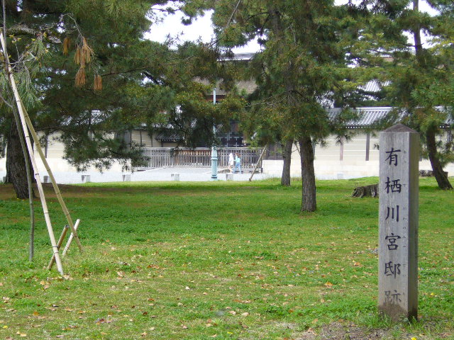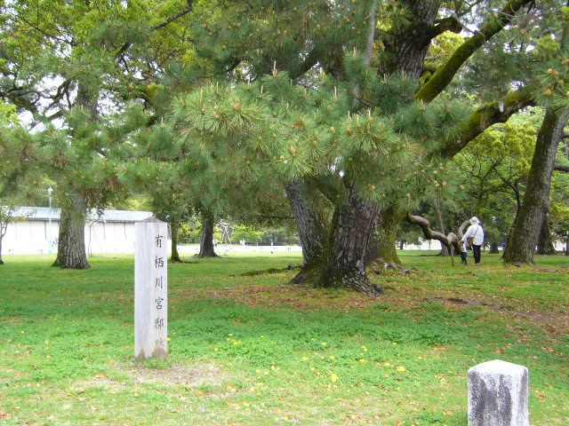 有栖川宮邸跡は京都御苑内のほぼ中央に位置しどこから入っても同じ時間で行けると思います。有栖川宮家は閑院宮・伏見宮・桂宮と並ぶ江戸時代の四親王家のひとつで京都御所の建礼門の南付近にありましたが現在は木標のみとなっています。多くの屋敷があった京都御苑内ですが今は国民公園として整備されこの付近も緑多き場所として愛されています。