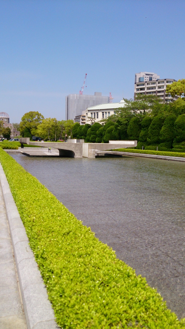 広島 平和記念公園の中心位置している施設で原爆死没者慰霊碑と一体となっており、この池の南端に慰霊碑があります。池の北端部分には平和の灯があって、平和記念公園の中心施設がまさに、この平和の池だと思います。原爆により水を求めて亡くなられた方がの御霊を慰霊するための施設であります。訪れたのが4月下旬の晴天の日でしたが、穏やかな水面が非常に印象的で、平和の尊さを感じる風景がそこにありました。平和記念資料館から原爆ドームまで南北一直線上に位置する施設です。