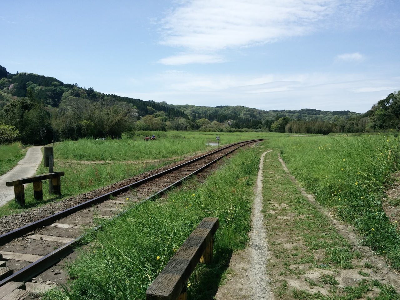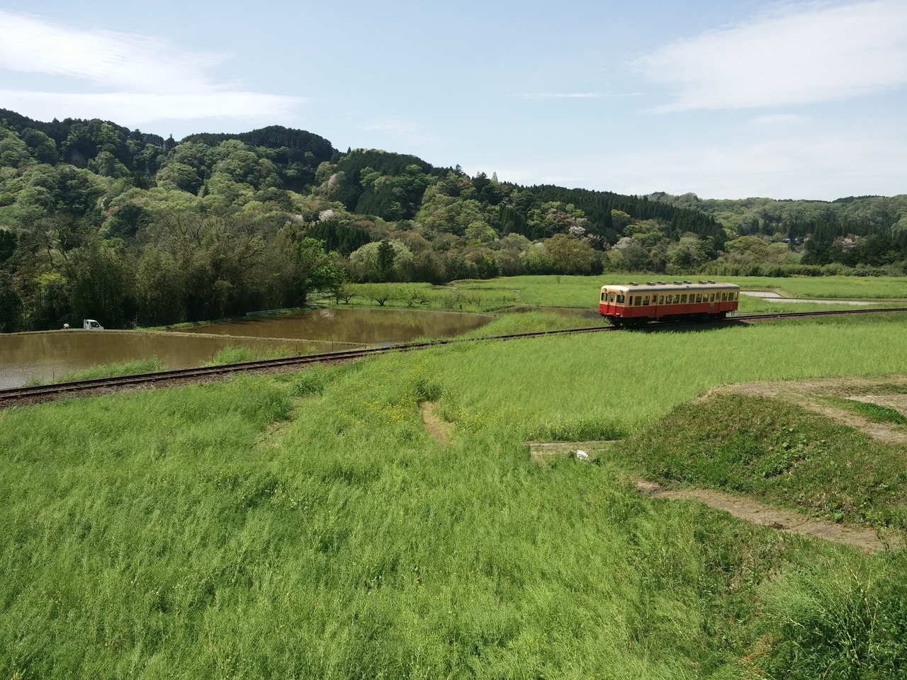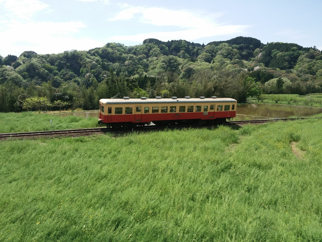 養老渓谷駅から車で5分ほどの場所にある菜の花撮影スポット石神。菜の花の中疾走する列車を撮影する事ができます。4月16日には残念なからすでに菜の花が終わっていましたが田圃に水がはられ新緑の色と香りがすがすがしい。実はマニアの方には新緑の中、水田に映る列車が撮影出来る人気のスポットとか。菜の花の後も楽しめますね