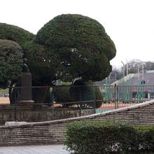 舞鶴公園の敷地内にある野外の陸上競技場です。競技場を囲むように福岡城跡の石垣や櫓が見えます。周りは観客席と言うか芝生が敷き詰められています。ちょっと勾配の緩いすり鉢の底のような感じでトラックがありました。