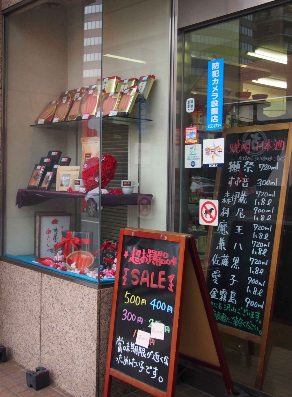 住吉神社の向かい住吉通りの近くにある博多明太子屋さん株式会社鳴海屋さんのショールーム兼直売所です。福岡空港内のお土産コーナーで良く見ますね。中は一般の方も自由に入れて買い物ができます。サービス品も置いてありました。