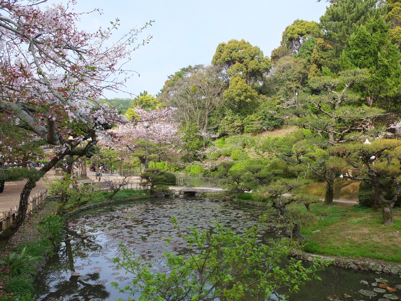 公園の中央は小高い丘になっていて、この丘に登ると、周囲を見渡すことができます。公園の伊予鉄道側は広に日本庭園になっていて、とても美しく整備されていて、中を歩き回ることができました。この庭園の反対側は広場になっていて、シートを敷いてご飯を食べている人たちや、広場で遊ぶ人たちで、とても賑やかで楽しそうでした。