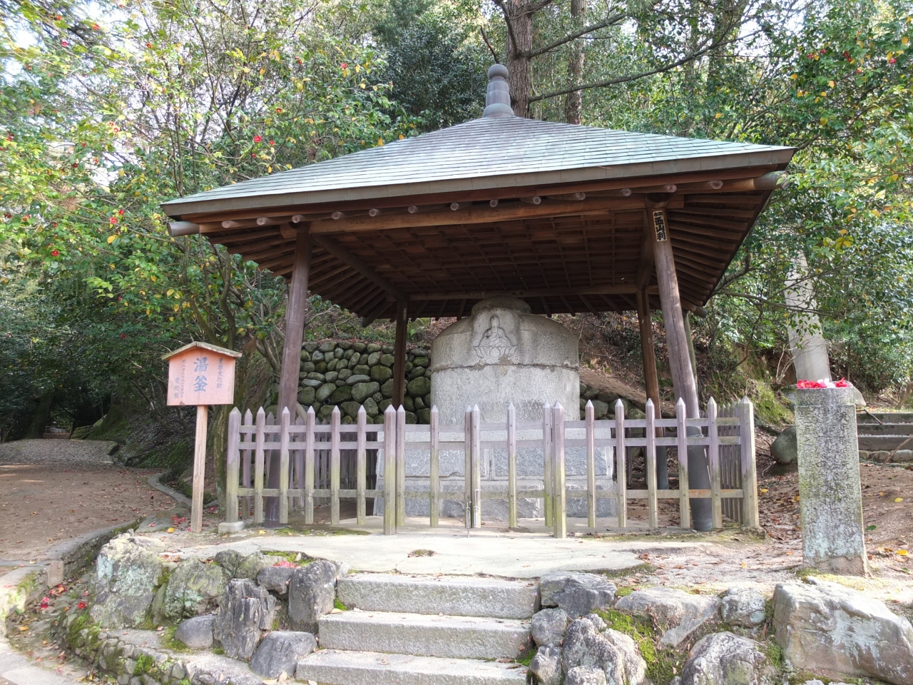 道後公園の入口(道後温泉駅側)近くに、湯釜薬師として祭られていました。この湯釜と同じものが、道後温泉本館の温泉で、実際に使われていました。この公園に祀られているものは、道後温泉で明治まで使われていたものという説明がありました。