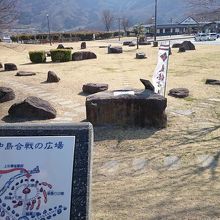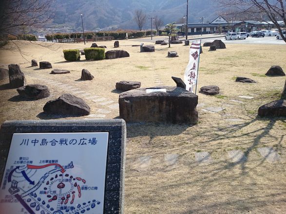 下り線の広場には川中島の合戦の陣形図があります。両軍の陣形が石で形作られています。当時の戦いに思いを馳せ、将軍の気分にひたるのも楽しいかと。