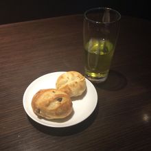 フードは柿ピーらしきおつまみと、メゾンカイザーのレーズンパンとレモンピール(オレンジだったかも)パン