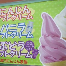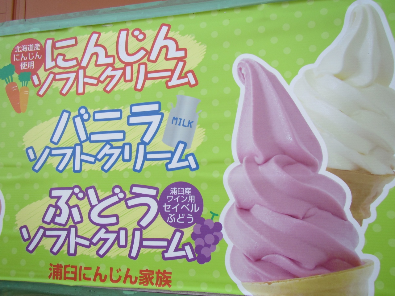 食べ物は、道の駅本体の建物(ふれあいプラザ)のあげいも、いももち、ヘルシー食品物産館の豆乳入りソフトクリーム、浦臼にんじん家族の浦臼産ワイン用セイベルぶどうソフトクリーム、豆乳クリームおやきなどが目につきました。
