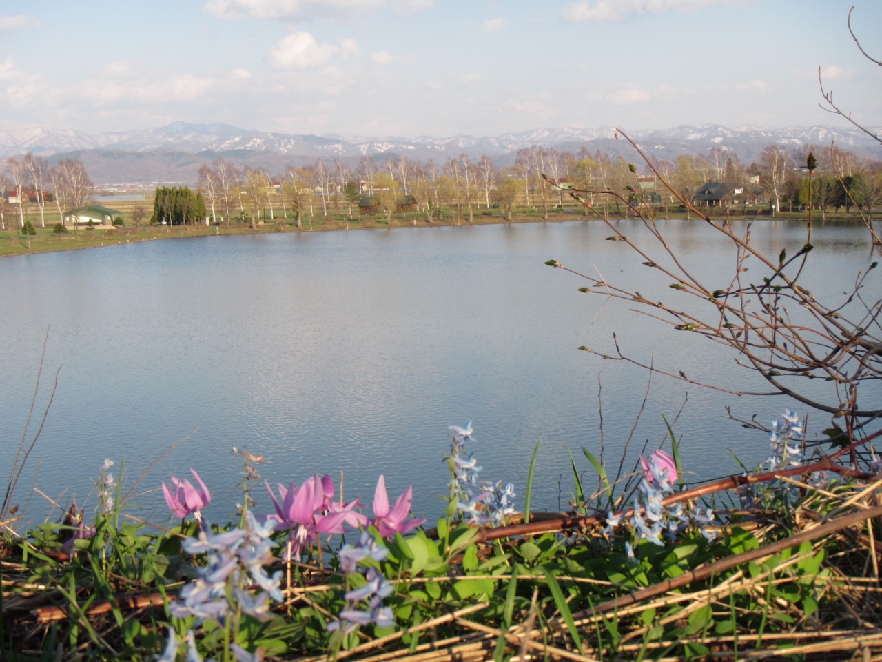 鶴沼公園の池を望む高台で、カタクリ、エゾエンゴサク、ニリンソウなどが咲いていました。