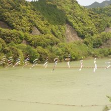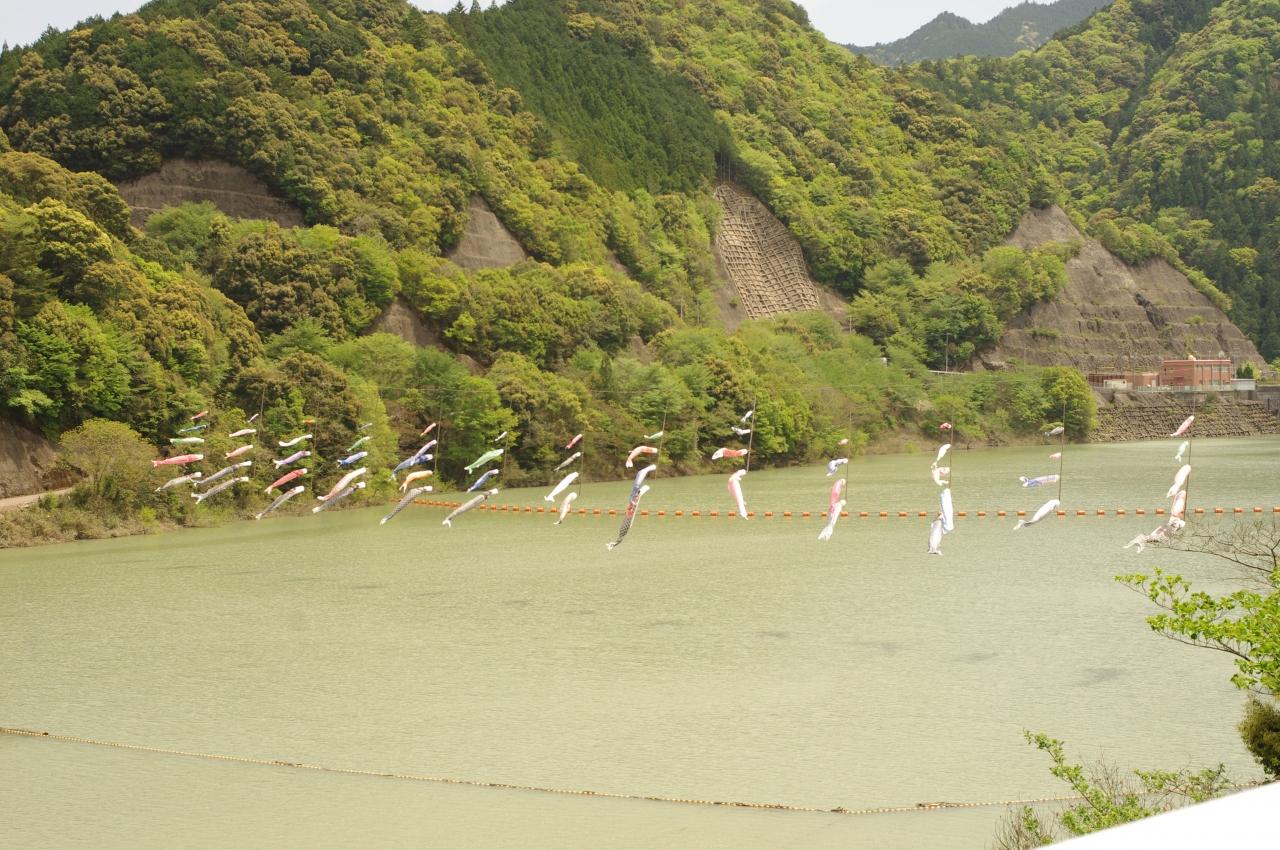 ダム湖に鯉のぼりが泳いでいるのが見えたので近くに行ってみました。ダム湖の周りを走っている道路の途中にちょっと車を駐車できるスペースがあって、そのあたりから見ることができます。