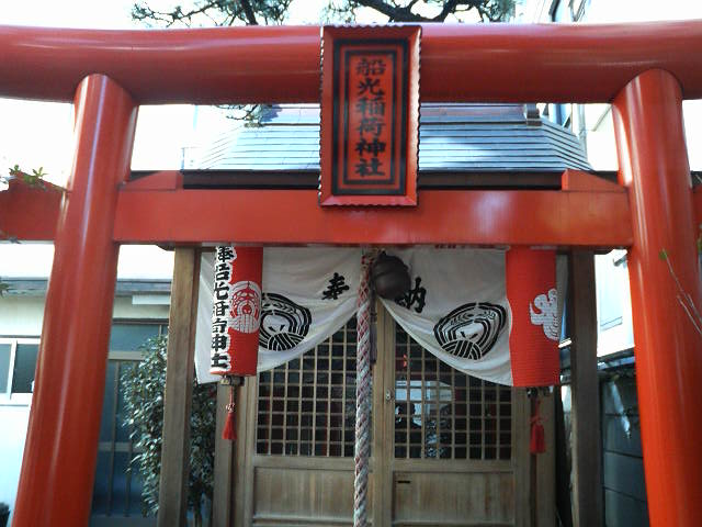 細い路地沿いに小さな鳥居と社がある簡素なつくりで、緑の植え込みの中の真っ赤な鳥居と灯篭が目立っていました。