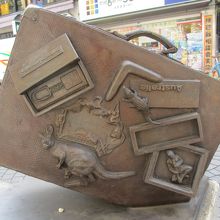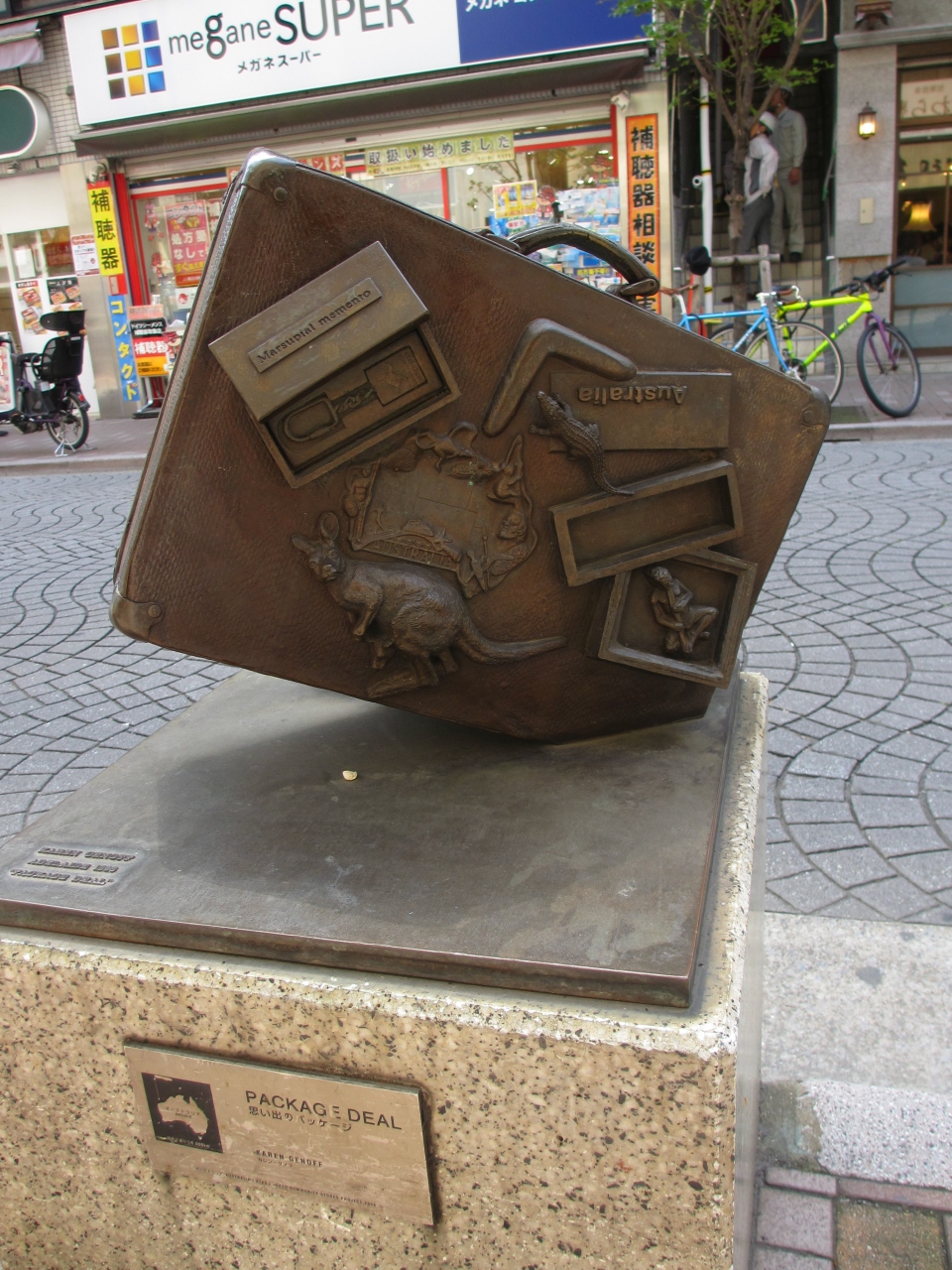 麻布十番商店街の両側の歩道を中心に、12のモニュメントが飾られています。これは商店街を温かな心が通う街にしようという思いから飾られるようになりました。その一つがオーストラリア大使館の協力のもと造られた“思い出のパッケージ”です。カバンにオーストラリアの象徴・カンガルーやブーメラン、キーホルダーなどが飾られています。