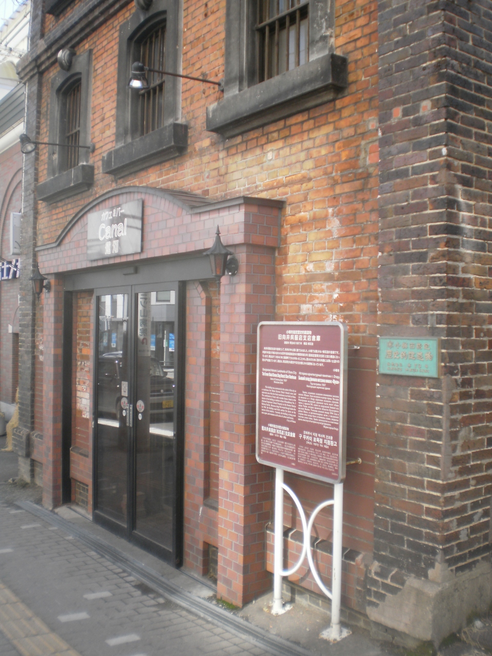 JR小樽駅からアーケード商店街を歩いていると、レンガ造りの歴史がありそうな建物の旧向井呉服店支店倉庫にたどり着きました。 紫色の説明看板も立っていて小樽市指定の歴史的建造物とのことです。 そばにレンガ通りとかかれたアーケードもたっています。