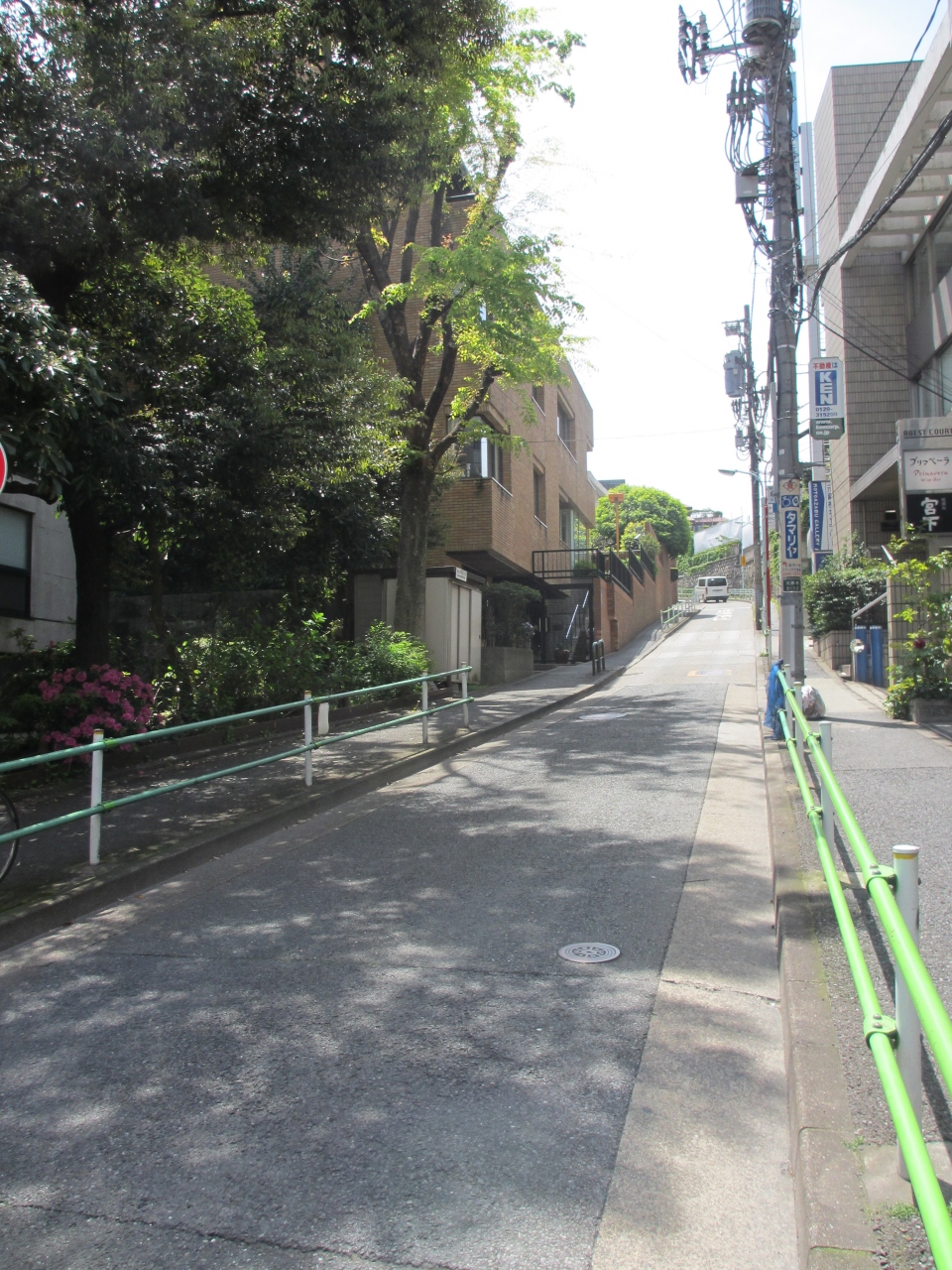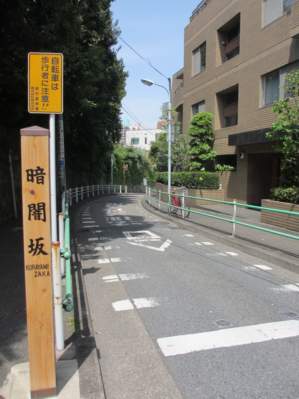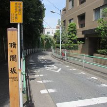 麻布十番駅から徒歩2分の暗闇坂下交差点から麻布十番大通りを横切った先の急な細い坂道です。坂道の中間にオーストリア大使館があります。樹木が暗いほどおい茂った坂だったそうです。狭い坂道の両側に歩道がありますが、一部左側の歩道が切れている箇所があります。抜け道のためかタクシーや乗用車がスピードを出して上ってきます。住宅街に不釣り合いなくらい交通量が多い坂です。
