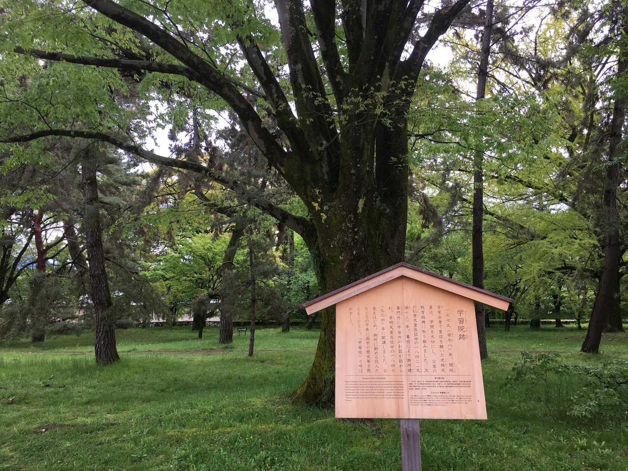 学習院の源流となった公家と御所に勤める役人とその師弟の勉学所の跡です。幕末の天保年間に、平安時代にあった大学寮以来の教育機関の設立を感じた公家が苦労して設立したらしく、大政奉還直後まで、国学や歴史等を学んだようです。
