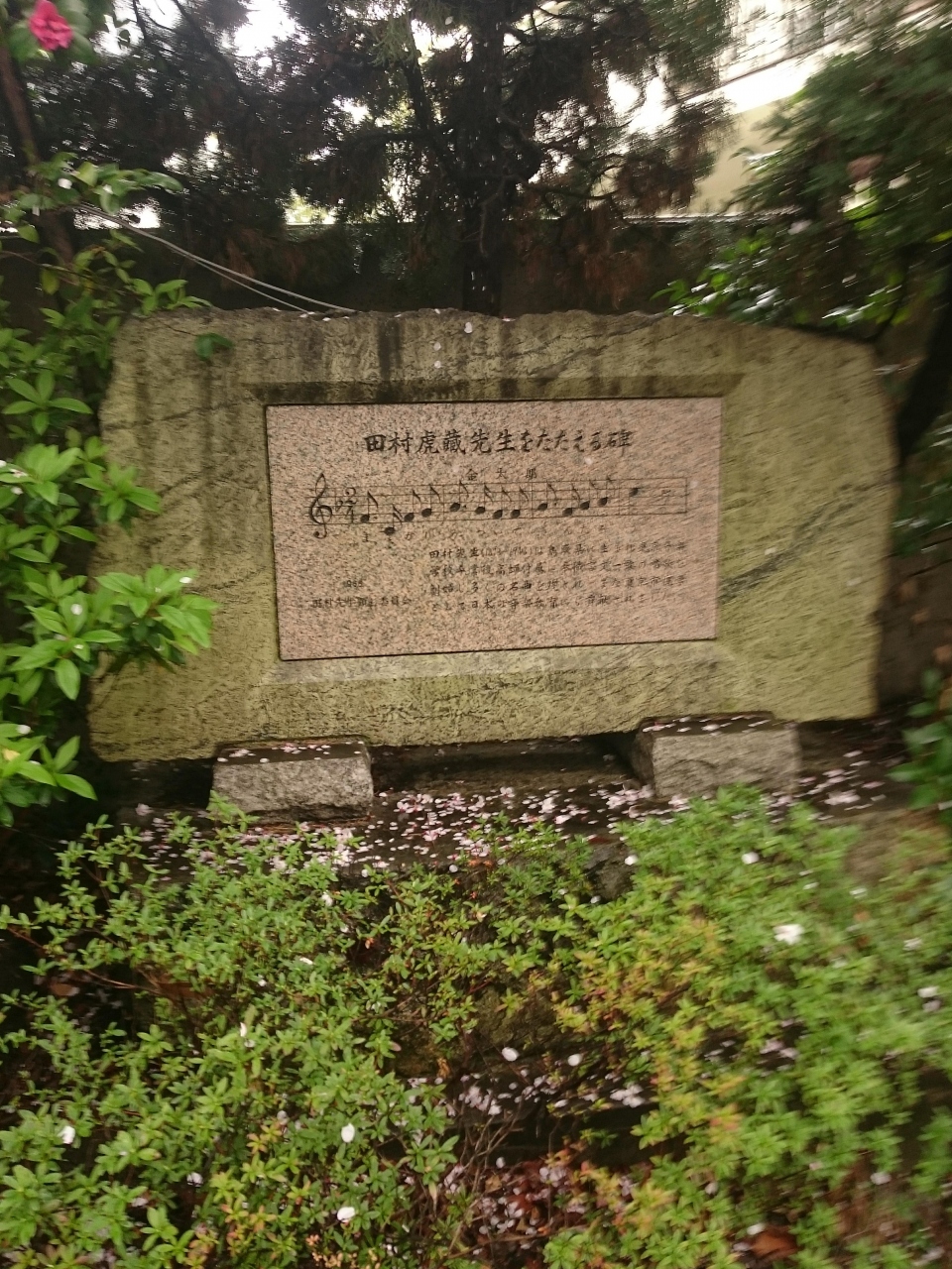 筑土八幡神社の階段を上がりきったすぐ左側に石碑があります。童謡として親しまれているきんたろうに関する楽曲の石碑があります。作曲家である田村虎蔵の生まれは鳥取のようですが、筑土八幡神社の近辺に住んでいたことからここに石碑があるようです。