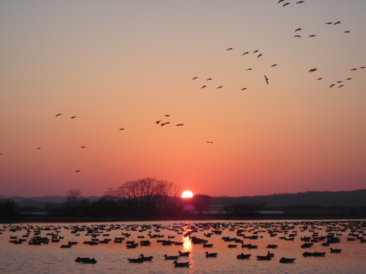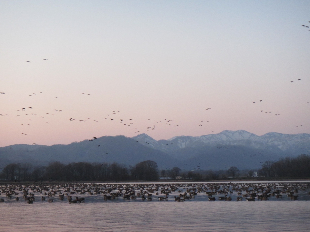 日の出の飛び立ちは10分程度の間に群れ全体が一斉に飛び立つため、とても迫力があるようですが、時間が春は4時30分ころ、秋は5時30分ころと、ちょっと観察しづらい時間帯です。