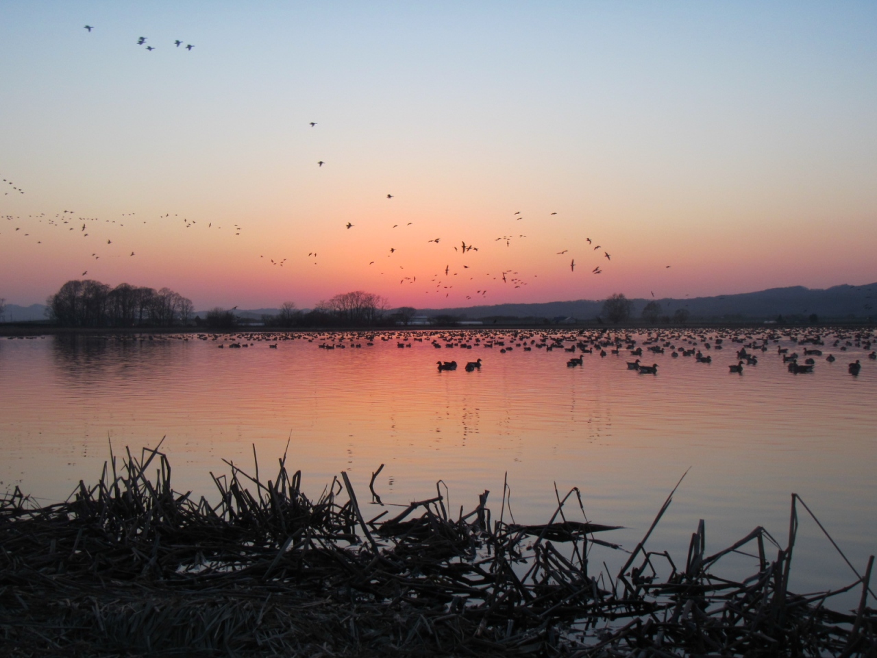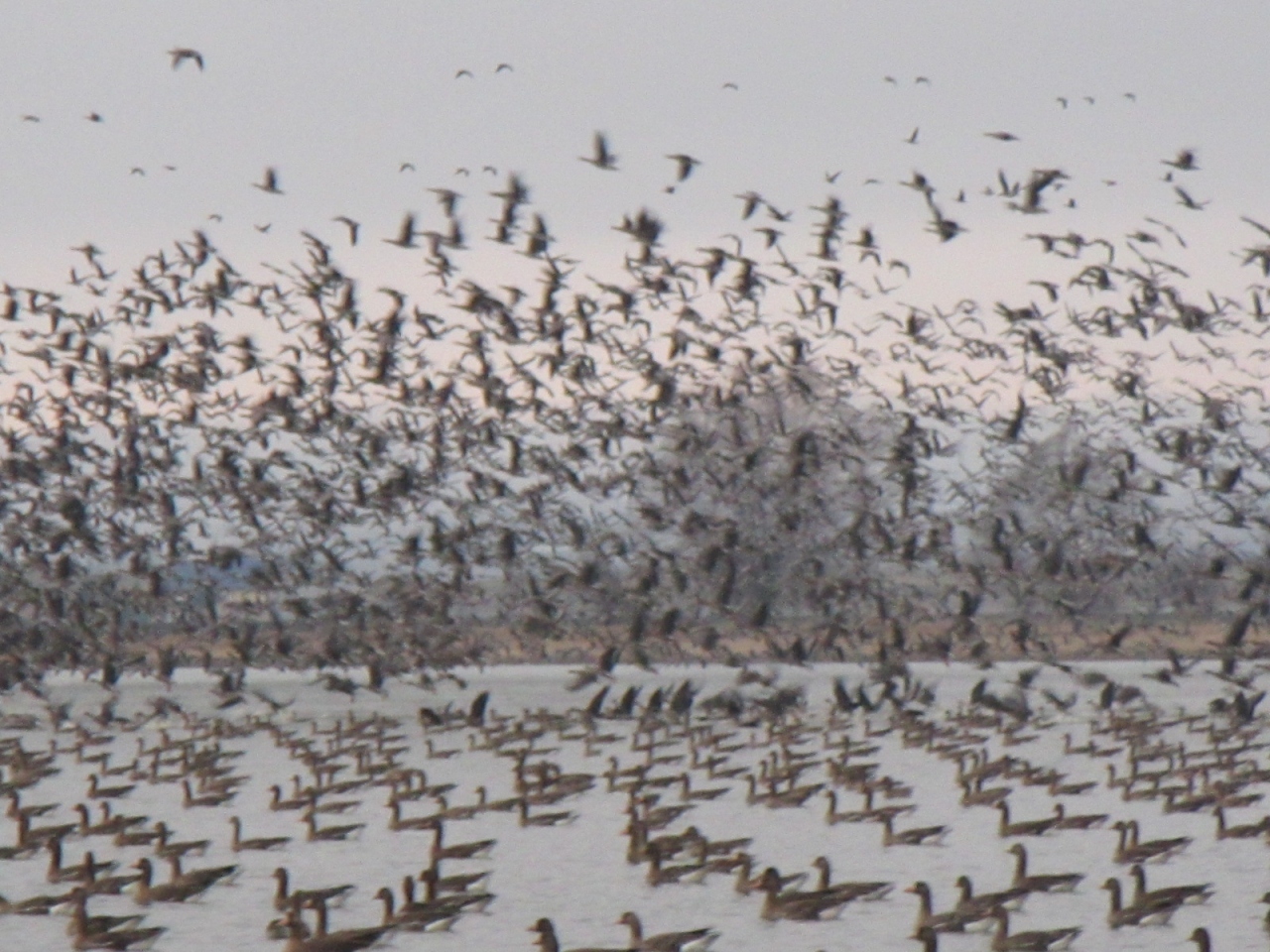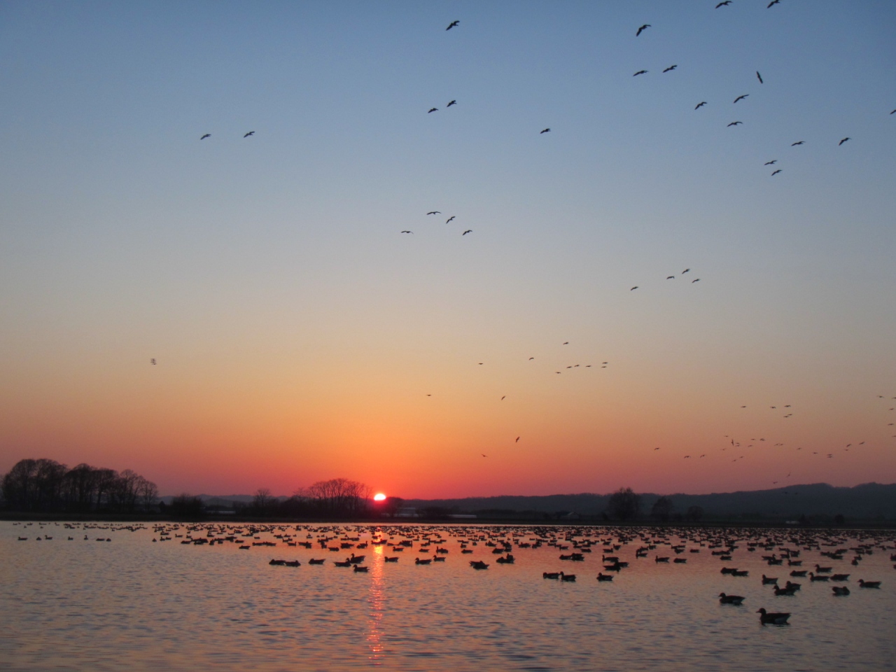 マガンにとっては災難ですが、運よく飛び立ちに遭遇したら、圧巻の光景が眺められます。