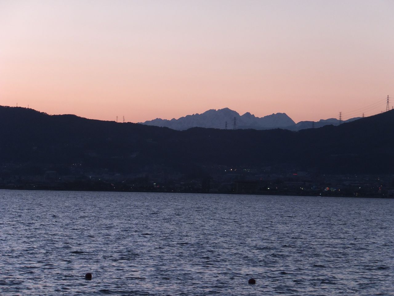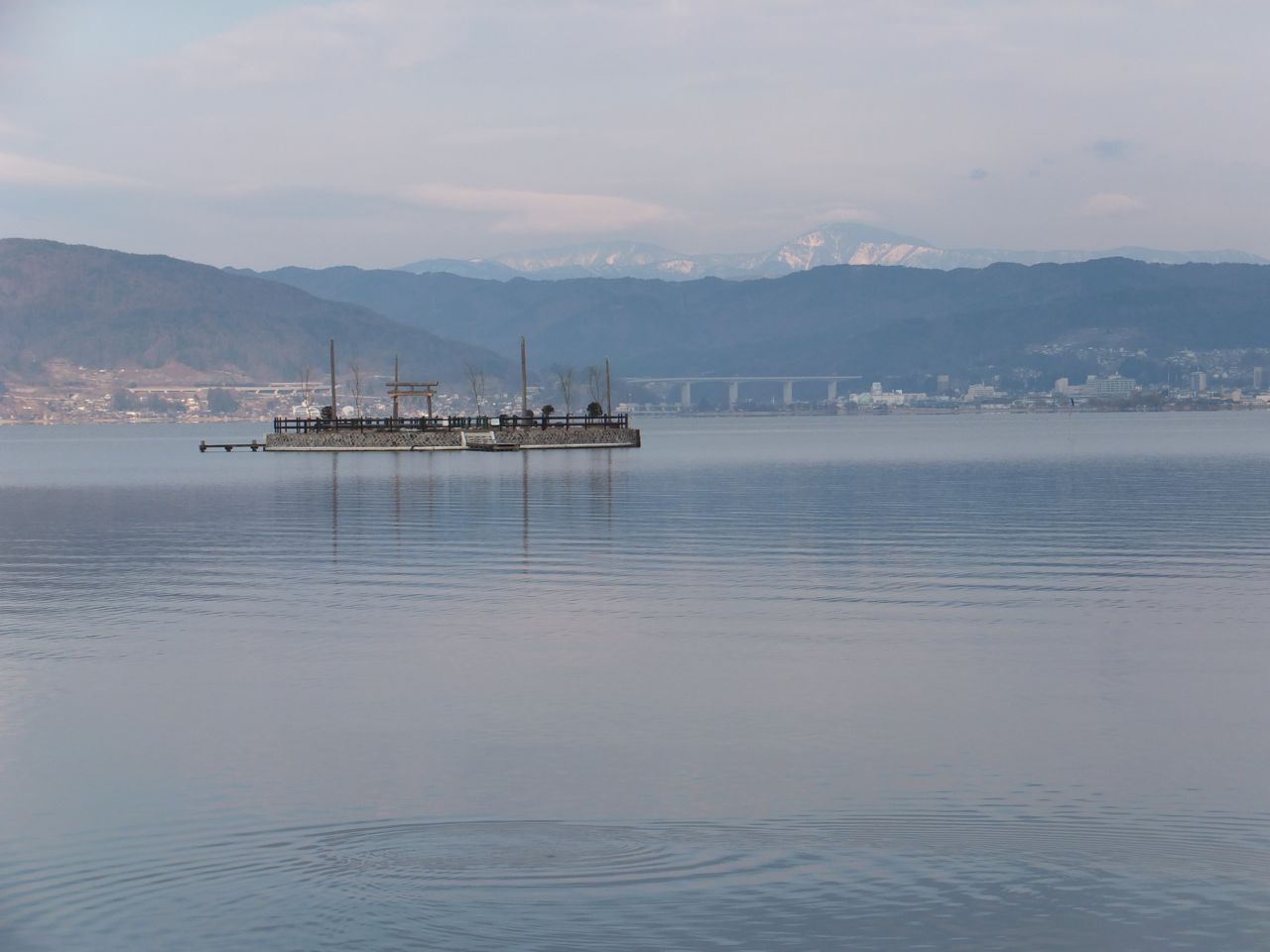 上諏訪駅の近くの湖岸からちょっと沖に島があり、神社の鳥居とやはり4本の御柱が見えます。