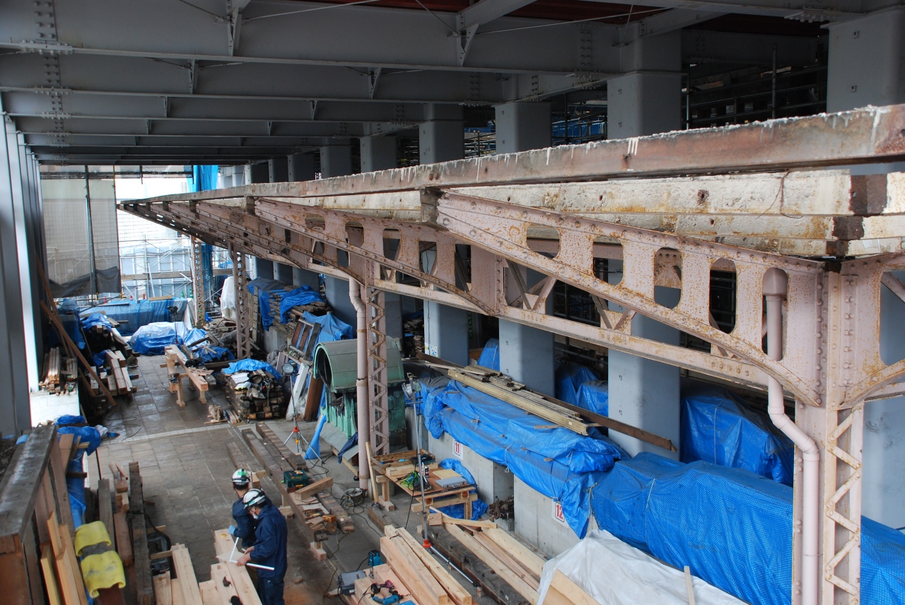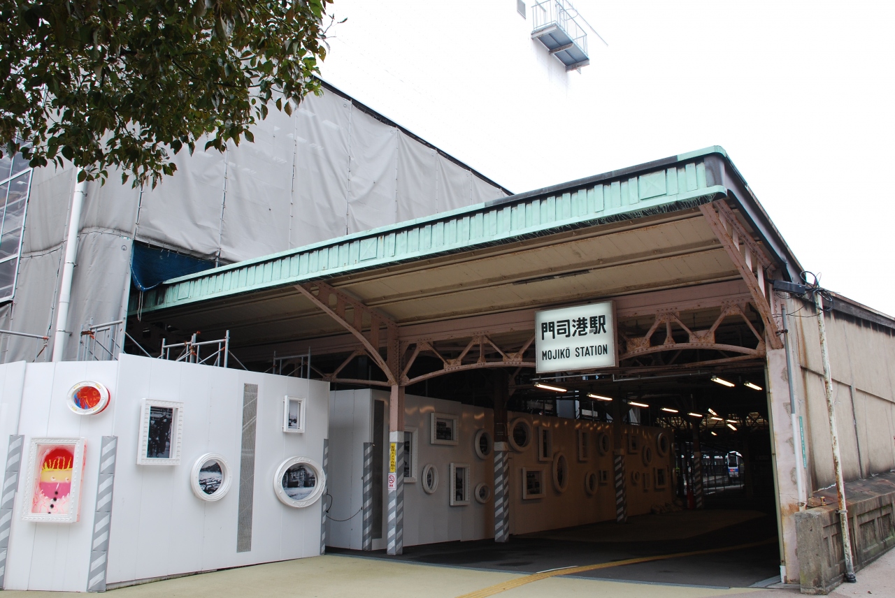 門司港駅の駅舎は2014年に開業100周年を迎えましたが、以前より老朽化が進んでおり2012年から大規模な改修工事が行われています。この改修工事は2018年3月末に終了する予定です。改札を出て左に進むと関門連絡船への連絡通路の階段が当時のまま残っていました。煉瓦造りの壁には監視孔なども残っており、歴史的にも貴重な建築なので改修工事が終わっても当時のまま保存される様な感じです。駅舎全体を見れないのは残念ですが、駅の外にある展望デッキからは工事の様子が少しだけ観る事が出来ました。