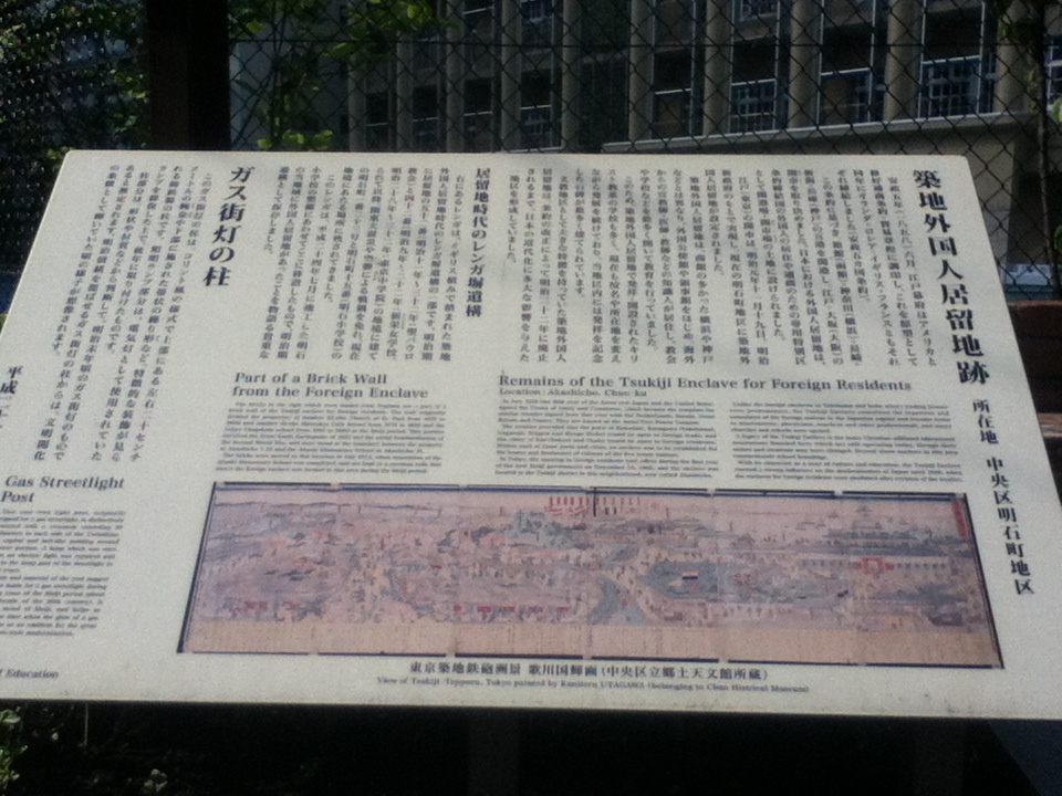 地下鉄築地駅の東側、明石小学校のグランドのフェンスの外側(明石小学校前交差点横)にこちらの説明板が立っている。週末午後のせいか、歩道は人が少なく、こちらの説明板を見ている人はいなかった。明治政府は、欧米五カ国との修好通商条約に基づき、現在の明石町地域を築地居留地と定め、外国公使館や領事館はじめ、海外の宣教師、医師、教師などの知識人が居住し教会や学校などを数多く開いて教育を行っていた。明治時代やこの界隈に関心や知識のある方は訪問するのもいいかもしれない。