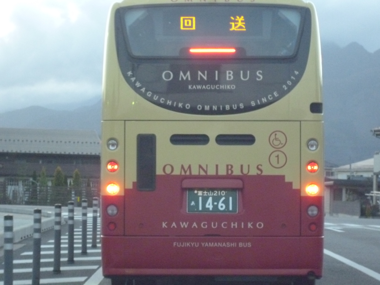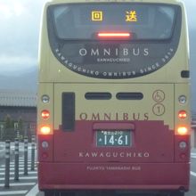 赤とイエローがおしゃれでかわいいオムニバスは、水戸岡鋭治さんのデザインです。河口湖の観光地を次々に行ってみました。湖岸の道路を走るときに、富士山が見えてきれいでした。乗ったり下りたりするときは、2日間フリー切符がお得です。