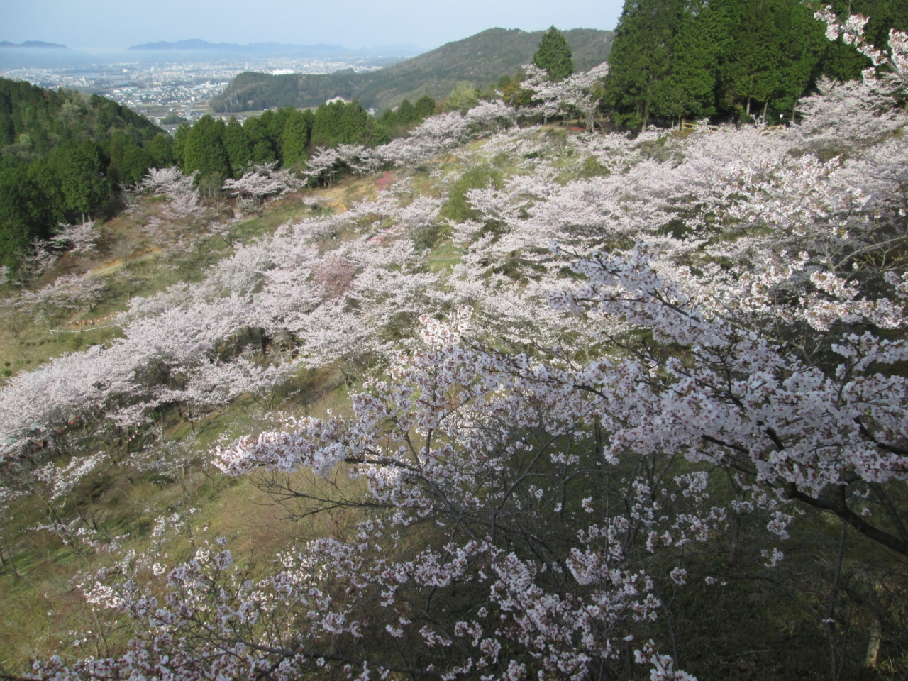 たくさんの桜が、山城跡の裾野を彩っていました。朝一番でしたので朝の柔らかい陽に照らされる桜が、いい彩りを見せてくれました。展望台からの景色も最高で、桜の園の全景を楽しむことができます。桜祭りも開催されていて、夜にはライトアップされるとか。