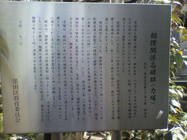両国にある回向院へ…。門をくぐって参道をまっすぐ行くと最初に「力塚」が見えてきます。