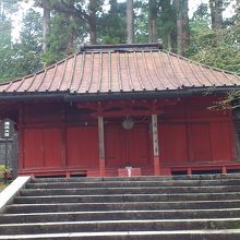輪王寺三仏堂の裏手に建つ朱塗りのお堂です。今は三仏堂が修理中なので、周りの工事歩道を伝わって裏手に回り込むと、この朱塗りのお堂がひっそりと建っていました。左隣には新しい護法天堂が建つたので、人々はそちらの方へ行ってしまい、このお堂の周りには誰もいませんでした。国の重要文化財だそうです。
