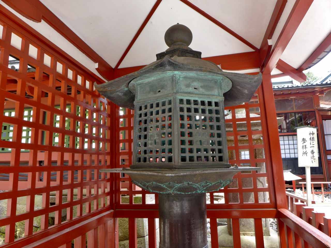 世界遺産に登録された日光の二社一寺のひとつ、二荒山神社の神苑内、本殿の脇に立つ銅製の燈籠です。