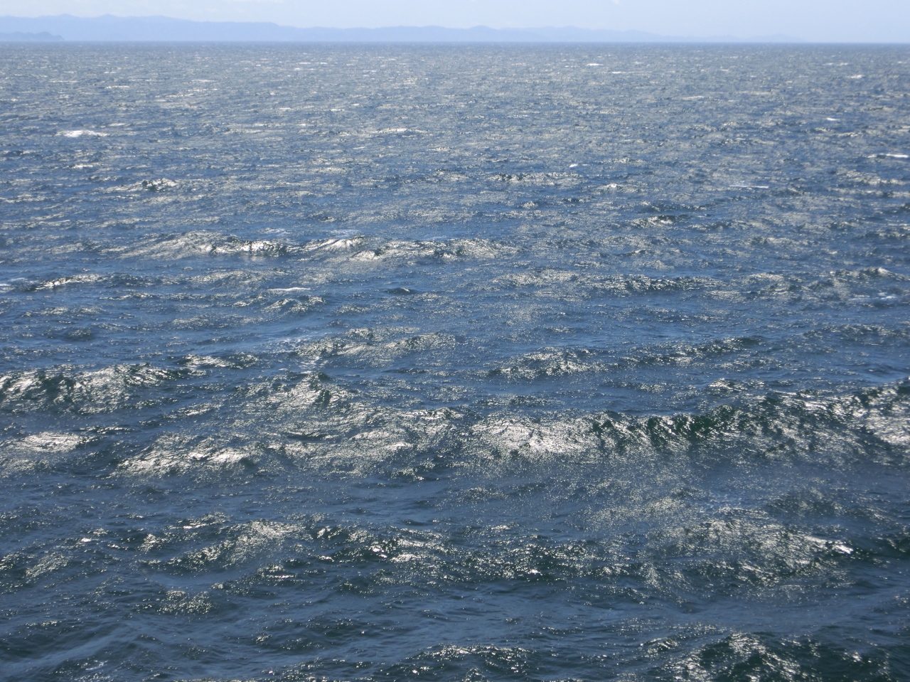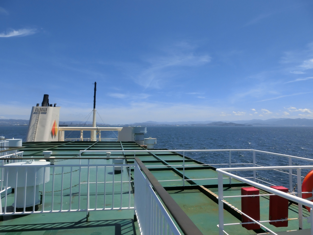 船はデッキから眺めるのもおもしろいです。海上は思いのほか日差しが強いので、夏場は日焼け対策が必須。出航直後、揺れる海域を通過しましたが、長くは続きません。景色は、出港すぐは和歌の浦の島々、途中、淡路島側に沼島、鳴門大橋遠望、など。