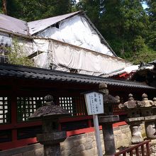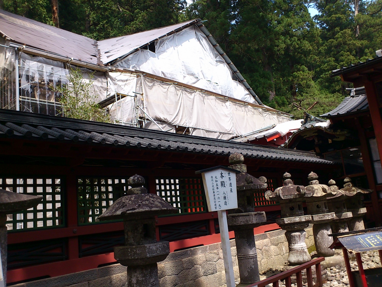 二荒山神社には料金を払って入る神苑という場所があります。その神苑内にこの本堂が建っています。拝殿の方は境内にあり、誰でもお参りできますが、なにも本堂を有料にすることもないと感じますが。日光のあちこちで工事中ですが、この本堂も工事中でした。