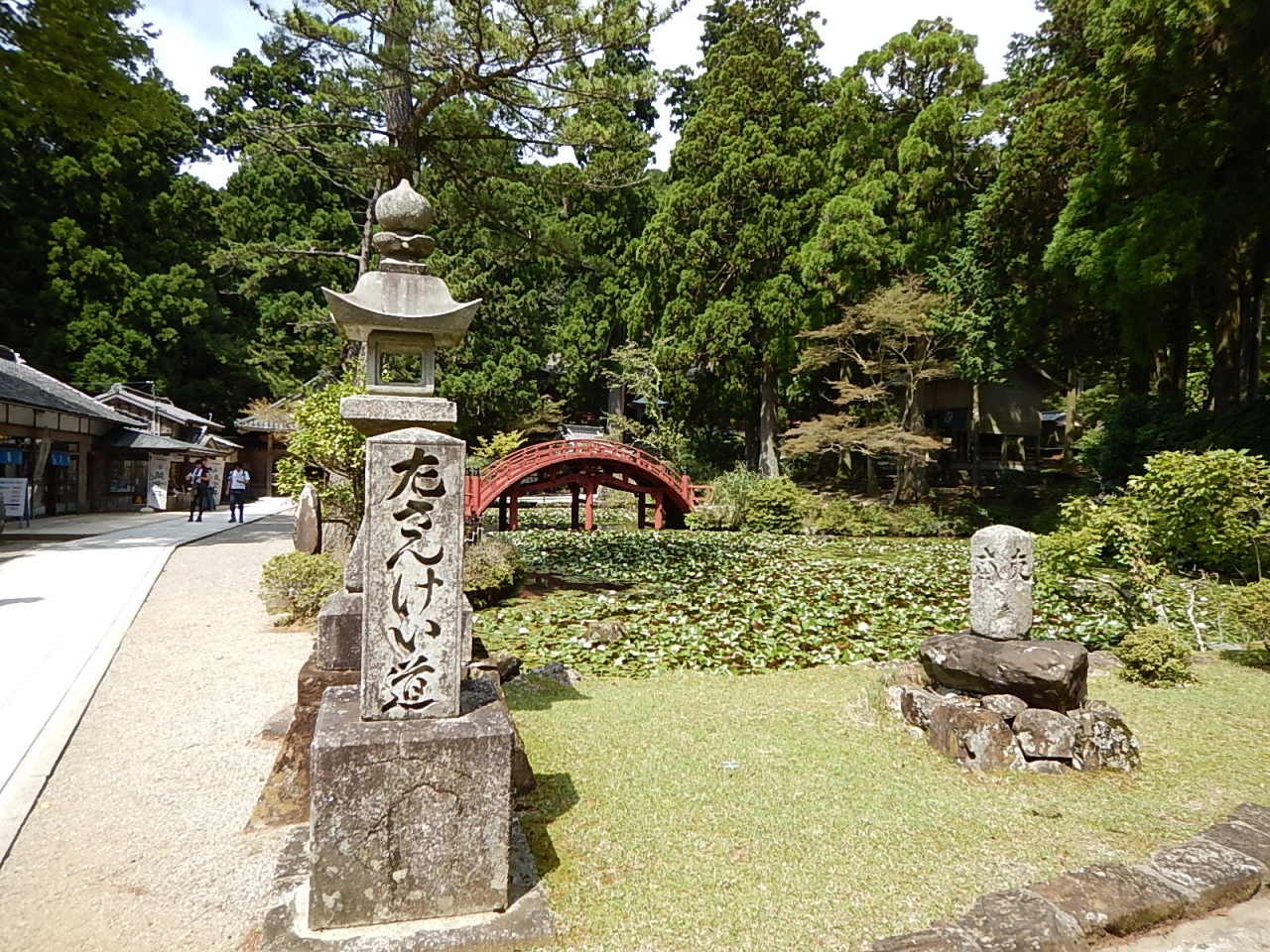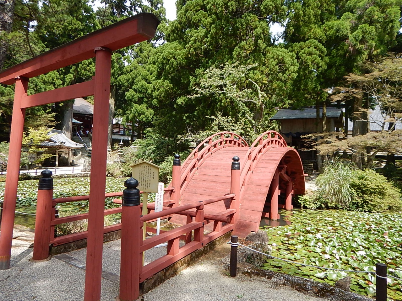 境内は広く、池に架かる朱塗りの太鼓橋など見どころも多い。拝観目安は30分。