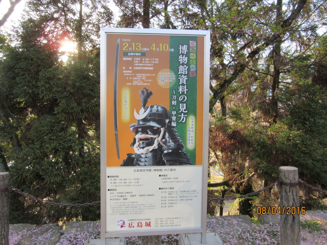 浅野家が入城し明治まで12代続いた。天守は昭和33年の復元だが、五層の天守閣は見応えがあった。天守閣から外に出て四方を見ることができた。城内の展示物が充実しており、1階=広島城の歴史、2階=武士の暮らしぶり 3・4階=特別展(刀剣展)、久々に見応えのある城であった。入城料金370円、65歳以上=180円。