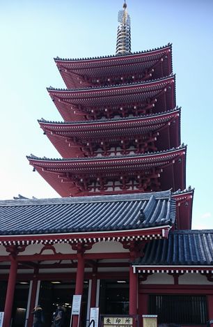 浅草寺の宝蔵門をくぐると、仏舎利が奉安された五重塔が左手に建っています。塔の部分だけでも48メートルあり、一際目を引く建物です。1945年に空襲で焼失し、1973年に再建されたそうです。一般の人は中には入れないようです。