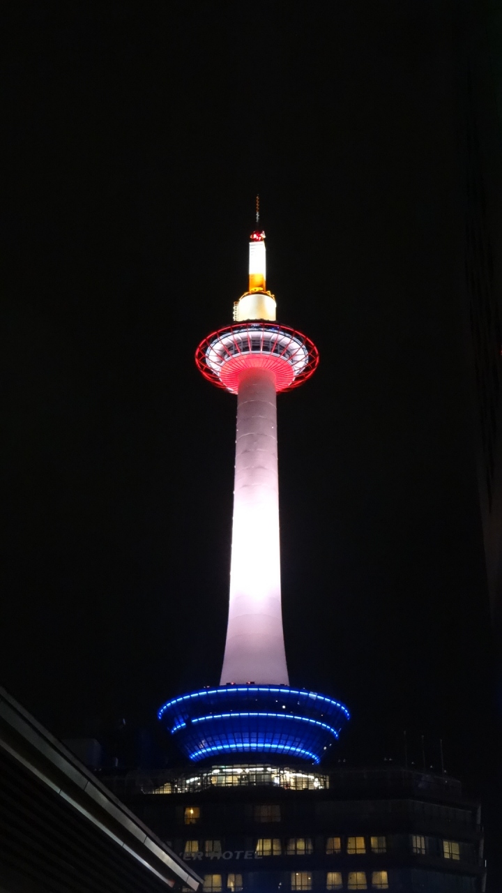 八条口(新幹線側)の反対の烏丸口前に高く聳え立っています。京都タワービルを含めた高さは131mあり、京都市内では最も高い建造物です。京都の「町家」の瓦葺きを「波」に見立て、海のない京都の街を照らす「灯台」をイメージしたものだそうです。地上100メートルにある展望室からは京都の市街地が360度見渡せます。展望室へ上がるには、800円くらいの料金だったと思います。向い側の京都駅ビルの空中経路から見るライトアップされたタワーがきれいですよ。
