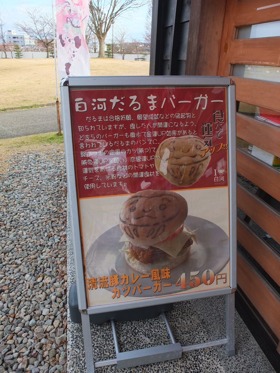 「白河だるまバーガー」が有名です。風水で金運アップ効果があるといわれるダルマの絵のついたバンズに、ゲンかつぎの定番のカツと、恋愛運の上がるトマト、さrないチーズなどを使用しています。
