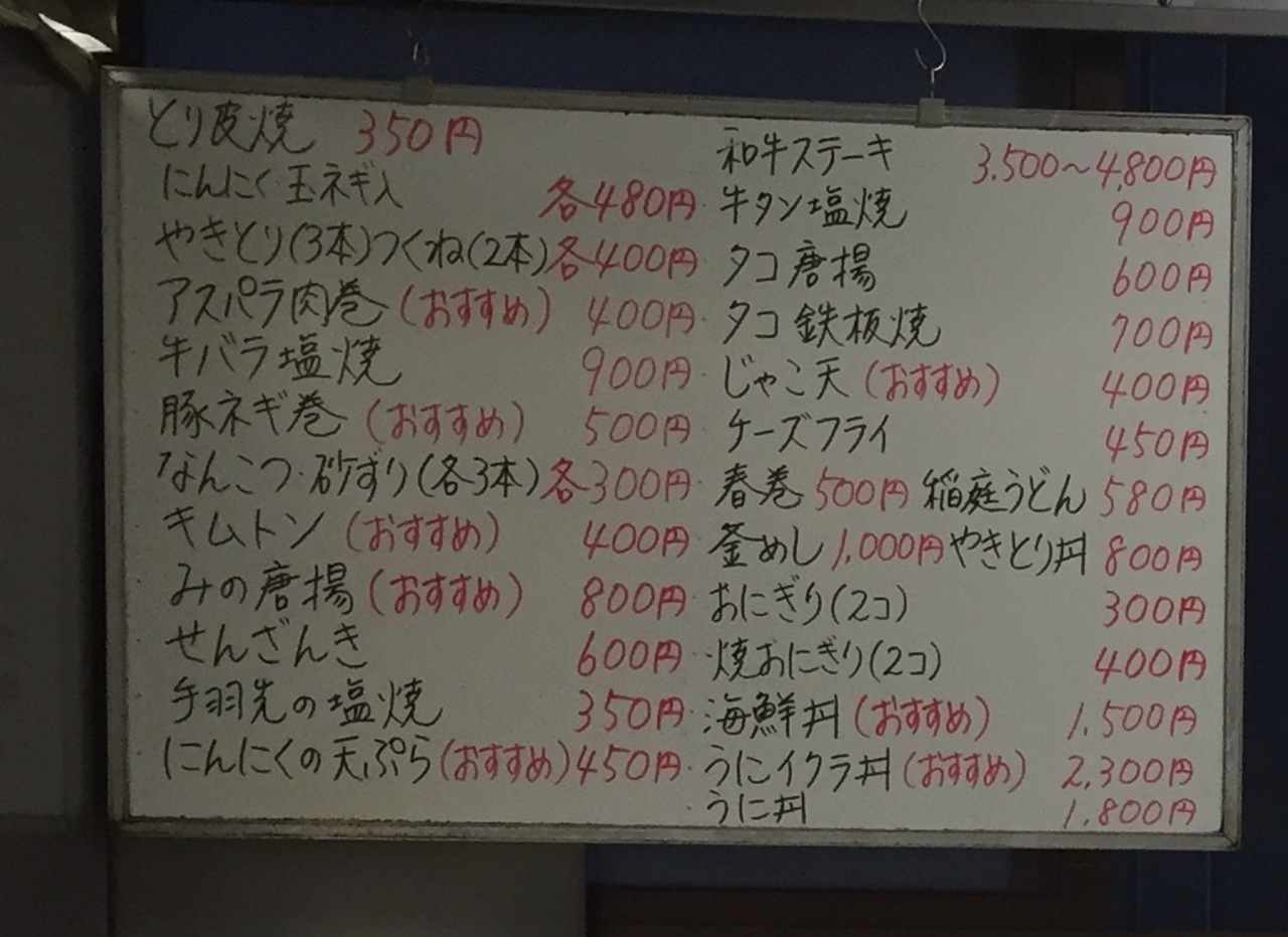 磯海楽と言う店の名前から海鮮物ばかりだと思うけれども、肉料理や焼き鳥、海鮮物の焼き物、サラダなどバラエティーに富んだ料理でコストパフォーマンスもまずまず。豚ネギ巻きがオススメ。刺身盛り合わせは普通。焼き鳥は砂肝は炭火焼きネギ回鉄板で焼いたものだった。甘辛いタレがこの店の特徴らしい。