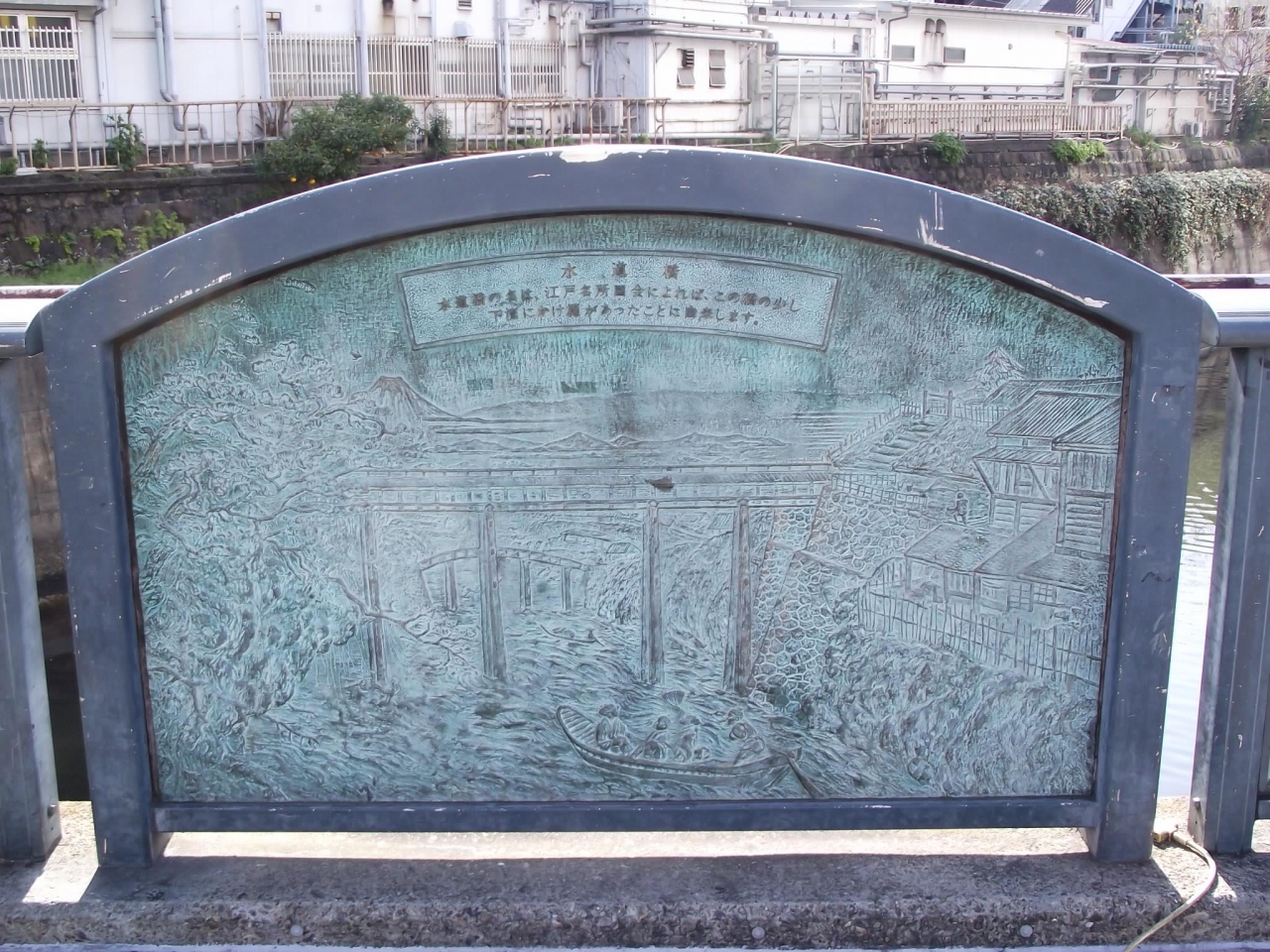 欄干の途中には、水道橋の江戸名所図会の大きなプレートがあり、橋名の由来も記されています。