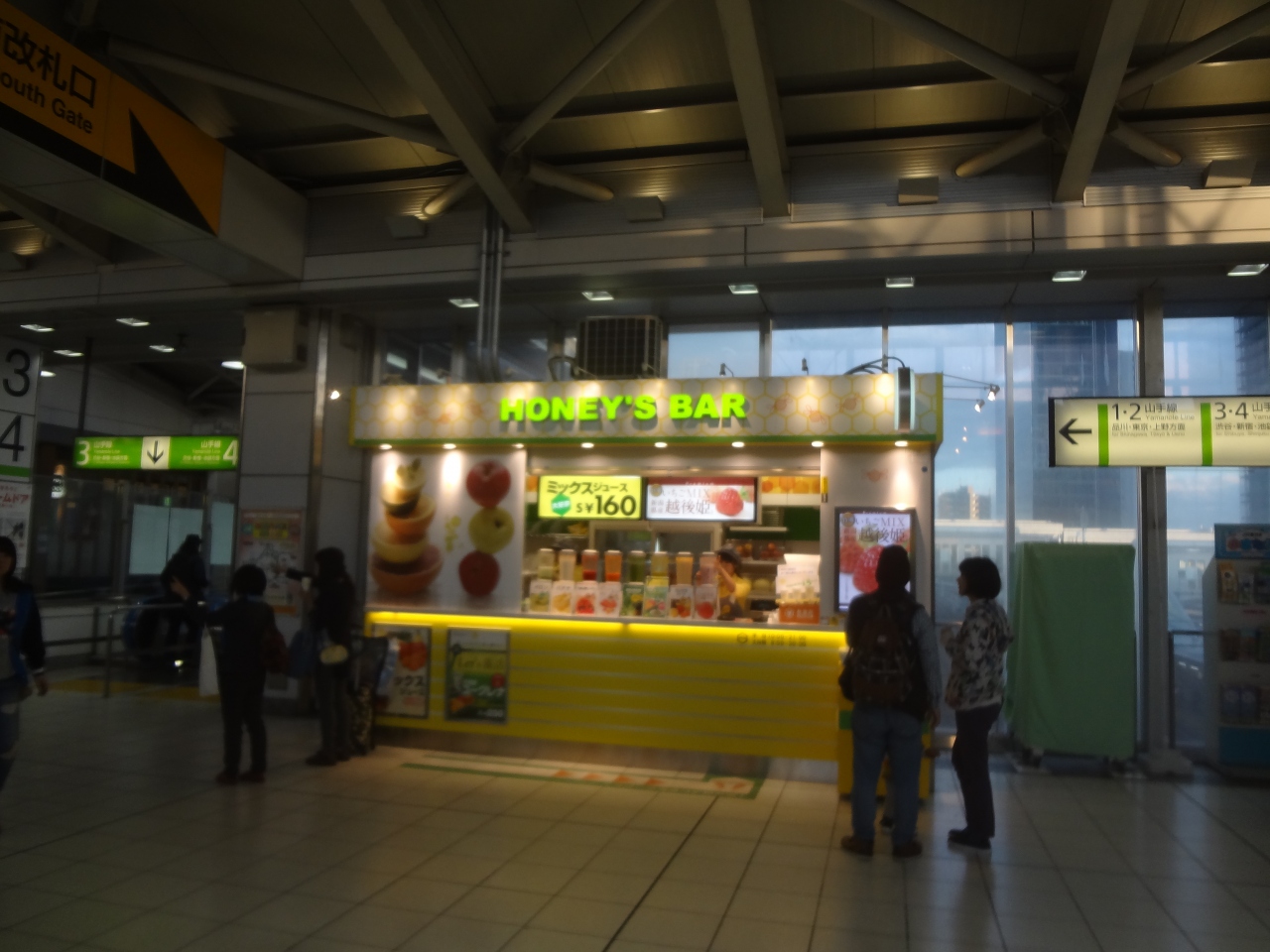 JRの駅のあちこちにあるハニーズバーです。ここ大崎駅にもできました。改札を抜けると正面にあるので、どの路線を使うにも目に入り、立地としては申し分ありません。ジューサーミキサーで作る生ジュースは自動販売機で売っているドリンクとはひと味もふた味も違います。Sサイズは160円から。そのSサイスだと、とても小さい紙コップなので、一気に飲み干してしまう量ですが、リフレッシュという面では効果てきめんです。