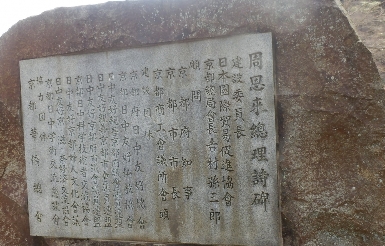 京都の名勝嵐山にある嵐山公園亀山地区に建てられている詩碑,故周恩来総理は青年期来日された時に京都の嵐山にも滞在された言われています、嵐山で雨中嵐山という詩をつくられたことから1978年日中平和友好条約調印記念として翌年この碑が建立された、参考資料+;現地設置の説明用石柱記載文
