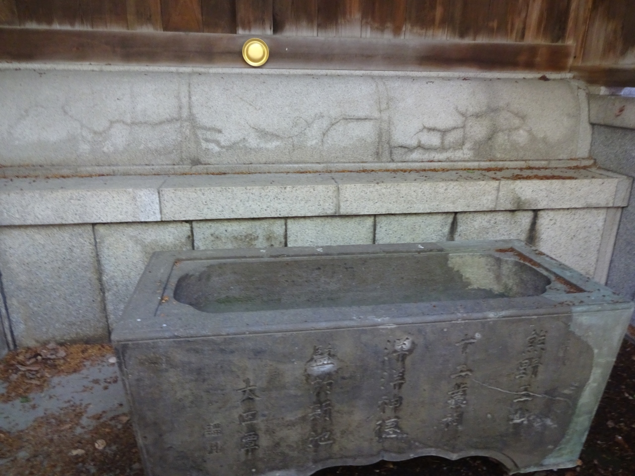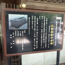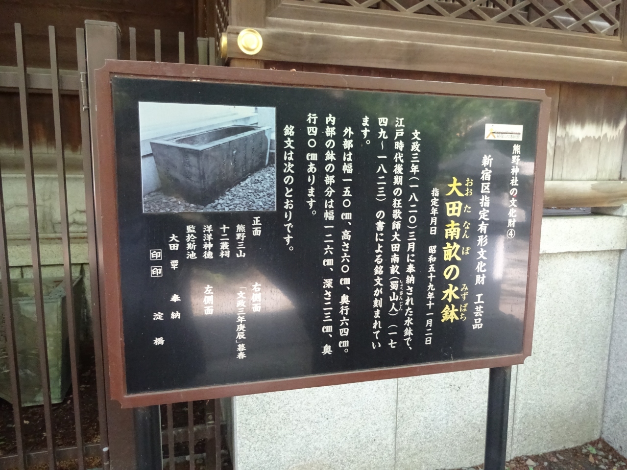 この水鉢は1820年に奉納されたもので、江戸時代の狂歌師「太田南畝(蜀山人)」が銘文を書いていることが、文化財として価値があるようです。