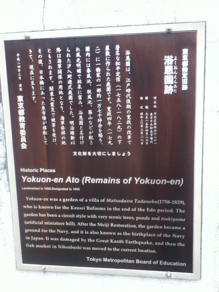 地下鉄築地市場駅の南東、地上出口を出た横の壁にこちらの説明板がある。歩道は多くの人が行き来しているが、こちらの説明板に目を留める人はいなかった。江戸時代中期、寛政の改革で有名な陸奥白河藩主松平定信は、老後、将軍よりこの付近の地を与えられたが、江戸湾に臨み風光明媚で林泉の美に富み、浴恩園と名づけた。松平定信やこの界隈に関心や知識のある方は訪問するのもいいかもしれない。