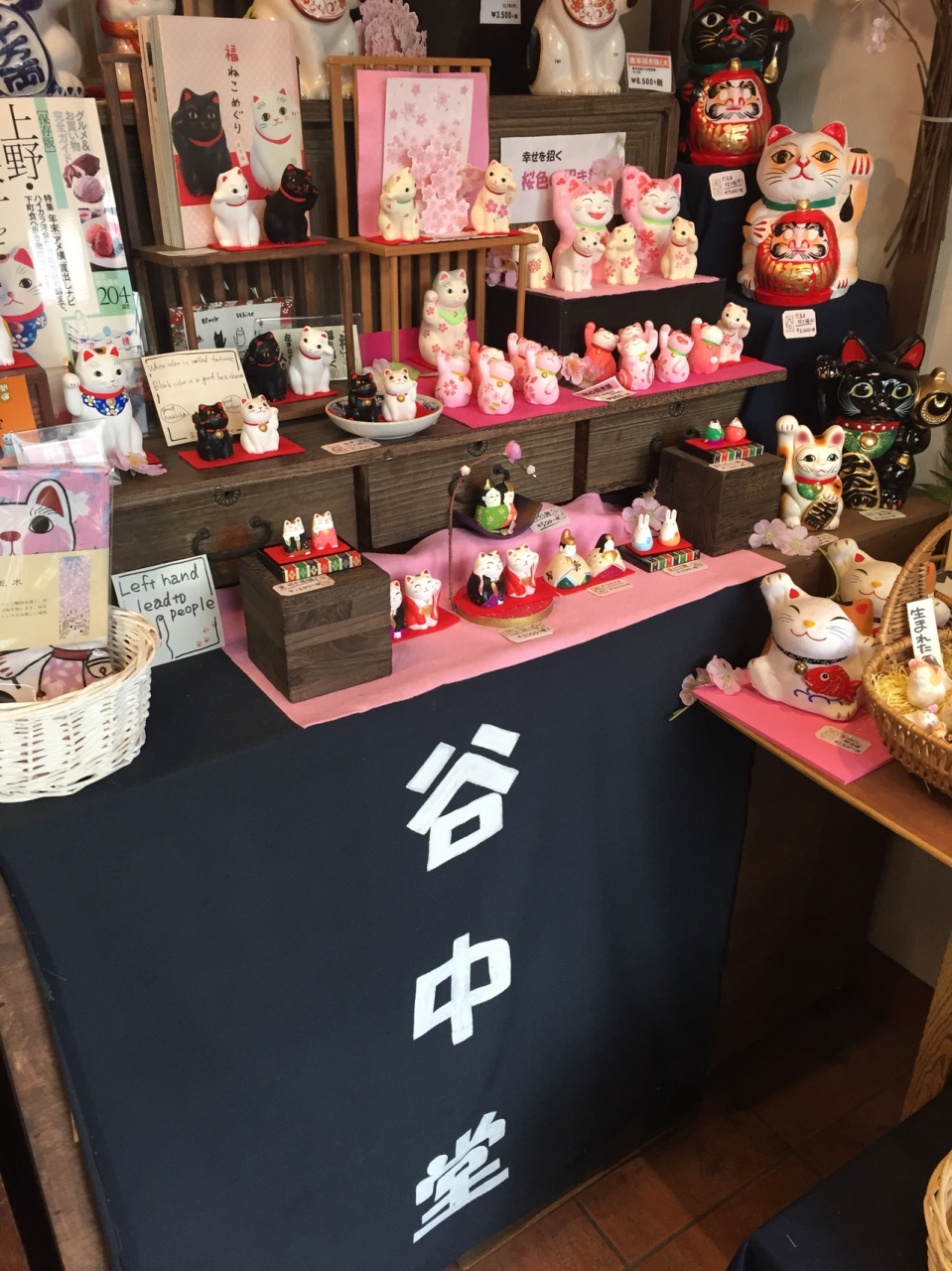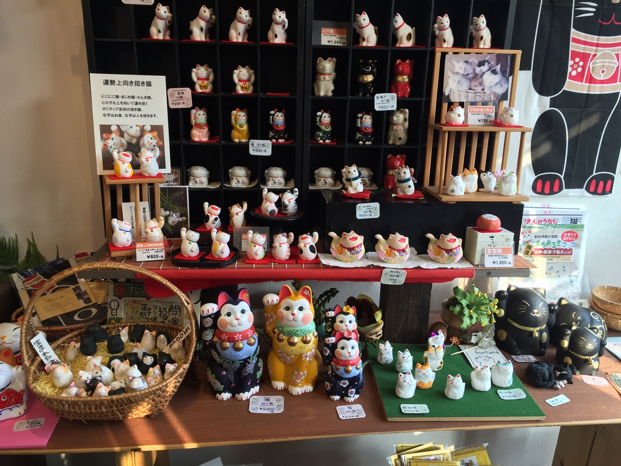 店内は非常に狭く、2ー4人が入るのがやっとです。大きな荷物を持って入ると、そこらじゅうのネコちゃん(招き猫の置物)にあたり落として壊してしまいそうです。招き猫の種類はいっぱいあり、購入するのにも迷ってしまいますが、きっとお気に入りのネコを購入することができます。