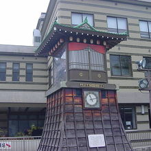 食べ歩きや散策も楽しい、石川県の山間にある山中温泉に位置するモニュメント。ちょうど温泉街の中心にあって、菊の湯や山中座などの名所に近いところです。すぐとなりの足湯(笠の露)に入っていると、となりでこの時計が動いていました。