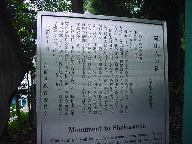 多くの観光客でにぎわう、上野公園とその周辺に残された石碑や遺構の一つです。大きな碑ですが、文字まではよく判読できないので、脇にある案内板を読みました。教育委員会が設置した説明板が親切で、歴史の勉強にもなります。